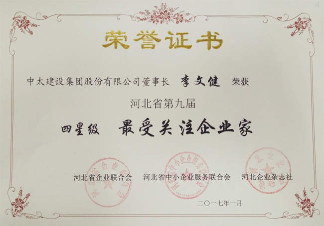 近日,河北省企業聯合會第六屆會員代表大會暨2017年河北省企業管理創新大會在石家莊召開,會議通報《河北省第九屆“最具影響力”“最具成長性”“最受關注企業家”評審結果》。中太建設集團獲評四星級“最具影響力和最具成長性企業”(“雙最”企業),李文健主席被授予“最受關注企業家”稱號。
