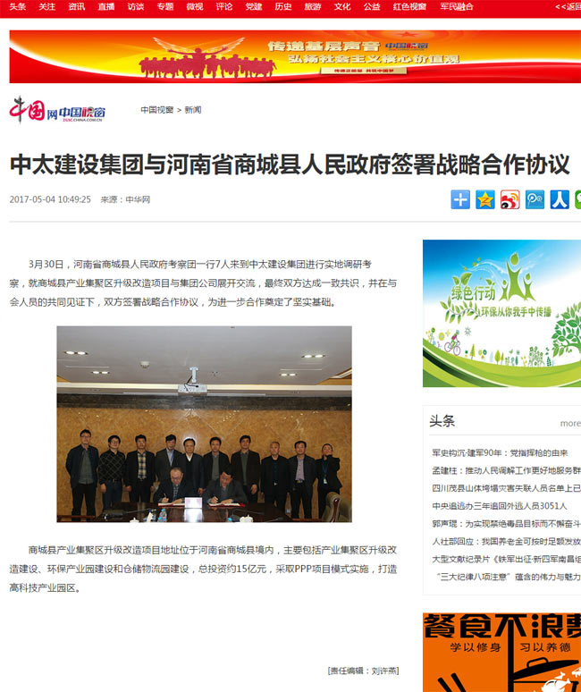 中國網報道了“中太建設集團與河南省商城縣人民政府簽署戰略合作協議”