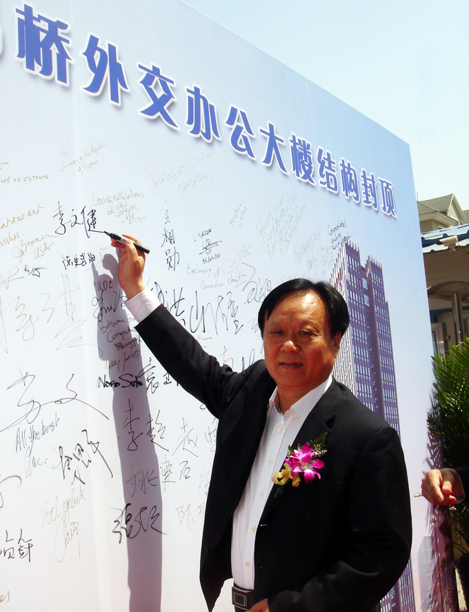 2013年5月15日上午,伴隨著最后一方混凝土的成功澆注,在50余名駐華外交使節以及外交部、北京市等有關部門代表的見證下,由集團公司第八工程局承建的亮馬橋外交辦公大樓工程正式實現主體結構封頂。董事局主席李文健(左一)應邀出席儀式。