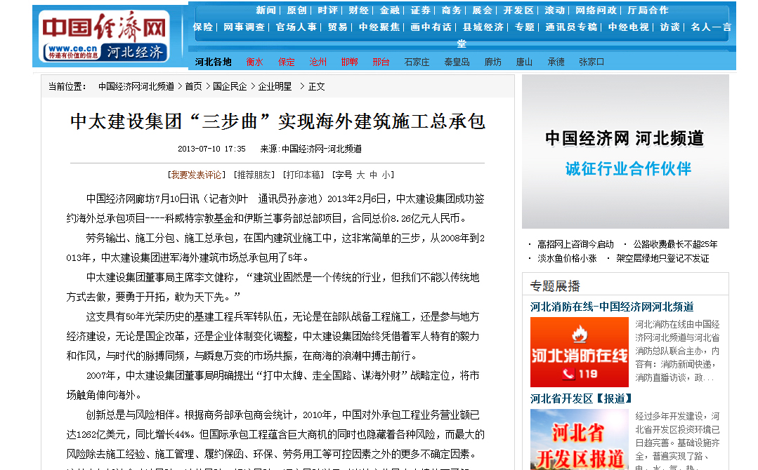 中國經濟網報道了中太建設集團“三步曲”實現海外建筑施工總承包