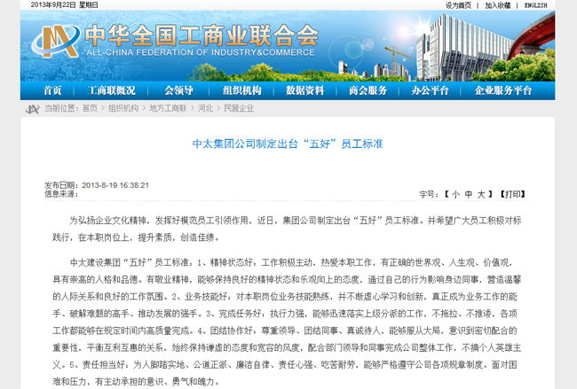 全國工商聯(lián)網(wǎng)站8月19日報道了中太建設(shè)集團(tuán)制定出臺“五好”員工標(biāo)準(zhǔn)